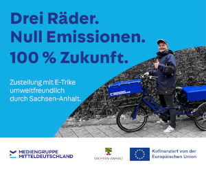 Einen weiteren Schritt zu mehr Umweltverträglichkeit hat jetzt die Mediengruppe Mitteldeutschland gemacht. Durch die Anschaffung von insgesamt 46 E-Trikes für ihren Bereich Post & Logistik sind die Zusteller der Mitteldeutschen Zeitung und der Volksstimme jetzt zwischen Altmark und Zeitz bedeutend umweltfreundlicher unterwegs. Die praktischen blauen Trikes wurden von der Europäischen Union kofinanziert und ersetzen zu Teilen die bisher im Einsatz befindlichen Verbrenner. Vorteil: sie verbrauchen in Zukunft wesentlich weniger Energie pro Kilometer als ihre Vorgänger.